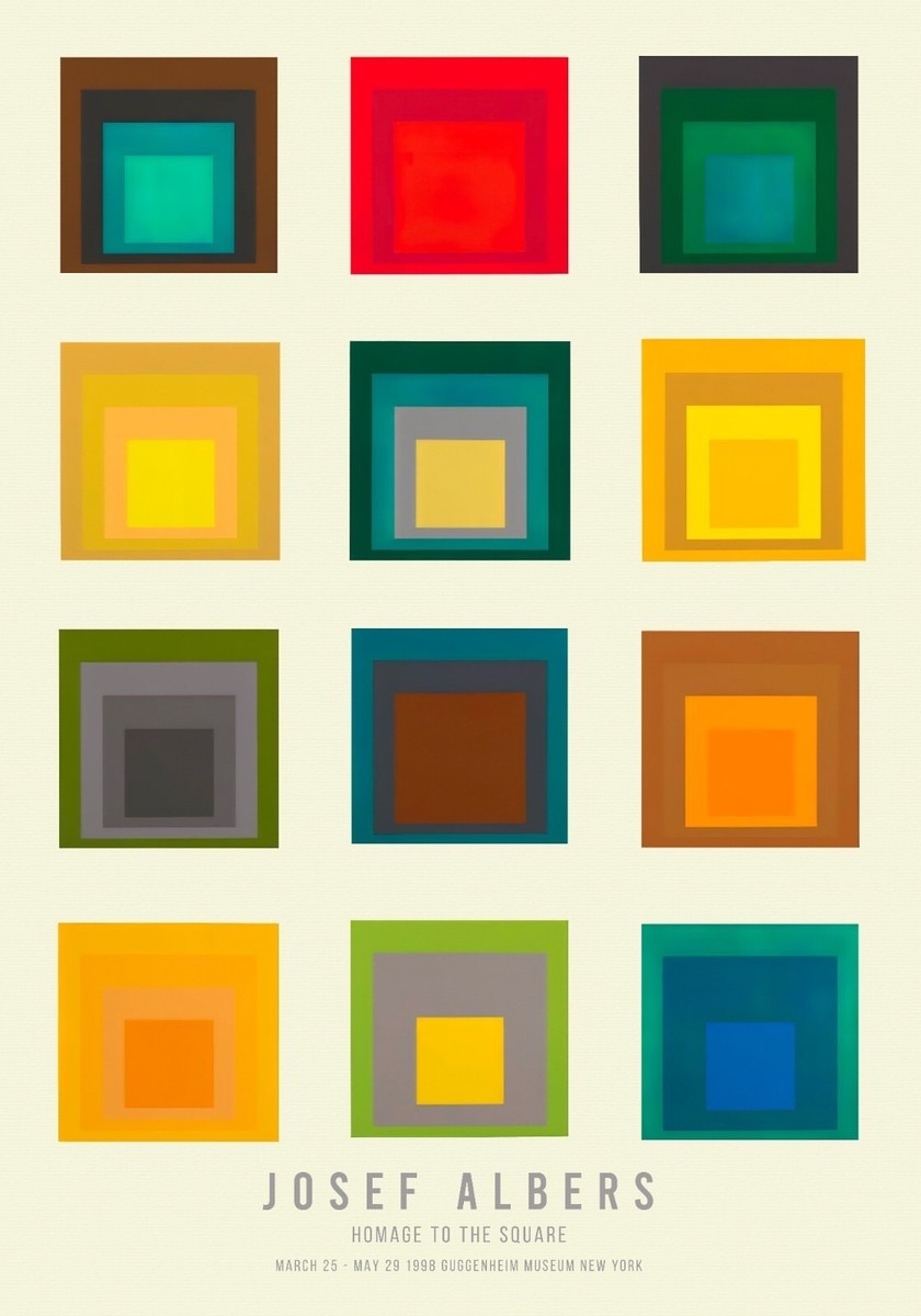 Comprising sets of squares—typically stacked atop each other—of colours in varying hues, saturation, and brightness, Homage to the Square showcases how complex colour can be, with their interaction with themselves and each other altering our perception of them. Here, idea is equally as important as execution, with Homage to the Square visually depicting how colour is in a constant state of flux and therefore can only be understood in relation to the colours that surround them.