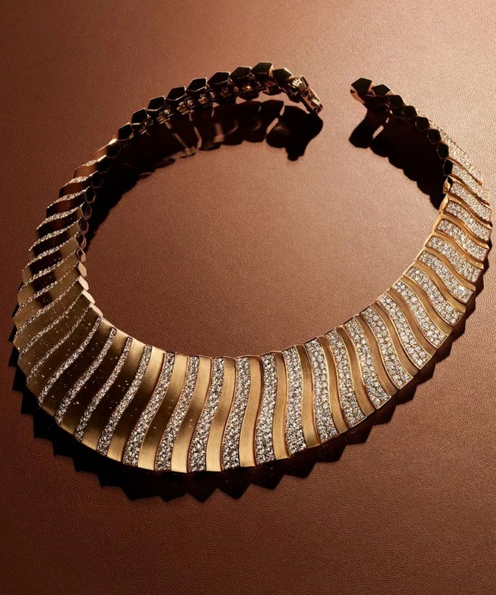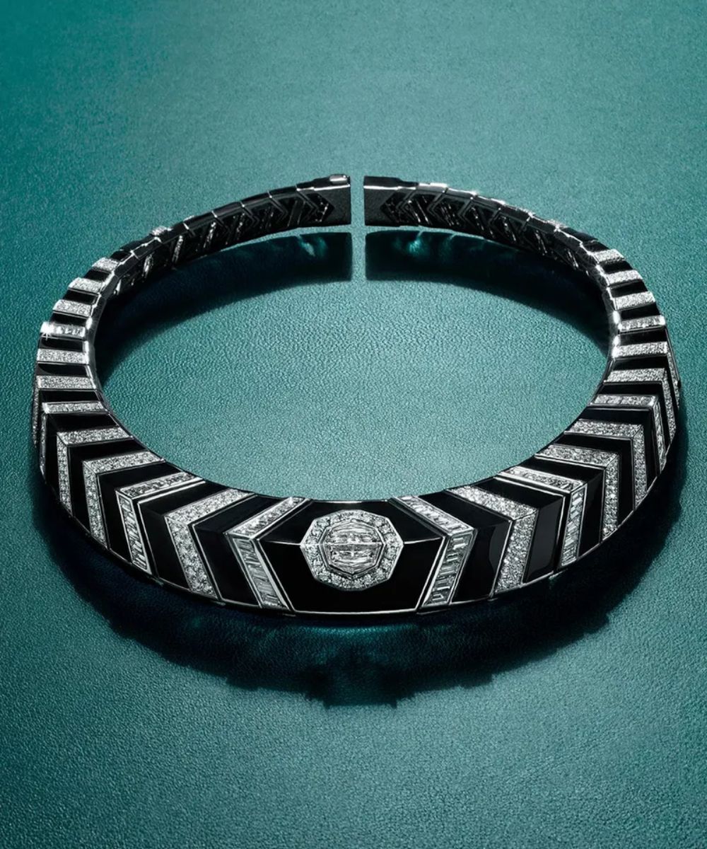 Less minimalist but equally wearable, Messika’s core high jewellery collections combine the brand’s graphic and architectural design codes with a surplus of pavé diamonds. While Messika has historically fixated on displaying the multifaceted nature of diamonds, more recent high jewellery collections have seen the brand embrace coloured gemstones, while incorporating organic silhouettes that draw inspiration from travel and nature — like the Terres d’Instinct collection, which translates the fiery dunes of the Namib into a rippled pavé and yellow gold necklace, while an onyx and baguette-cut diamond choker echos the graphic tension and colour palette present within the majestic zebra.