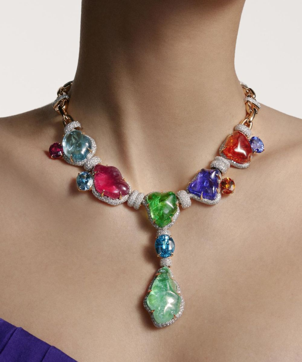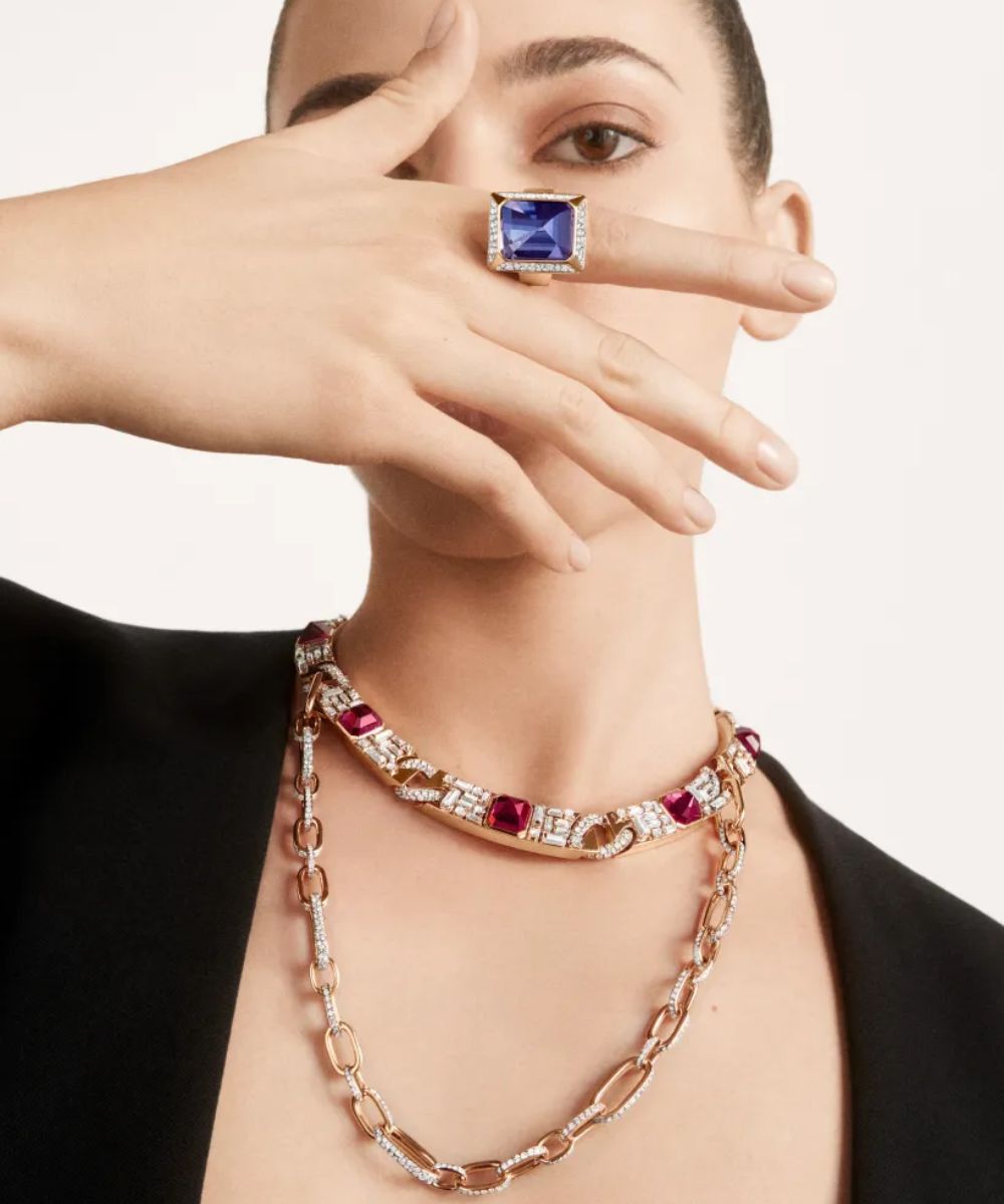 Today, Bulgari jewellery is defined by its use of volumes and sculptural details, as well as an unashamed embrace of colour, expressed through the skillful use of gemstones. The maison often employs cabochon cuts for its gemstones, which showcase the saturated hue of each stone.