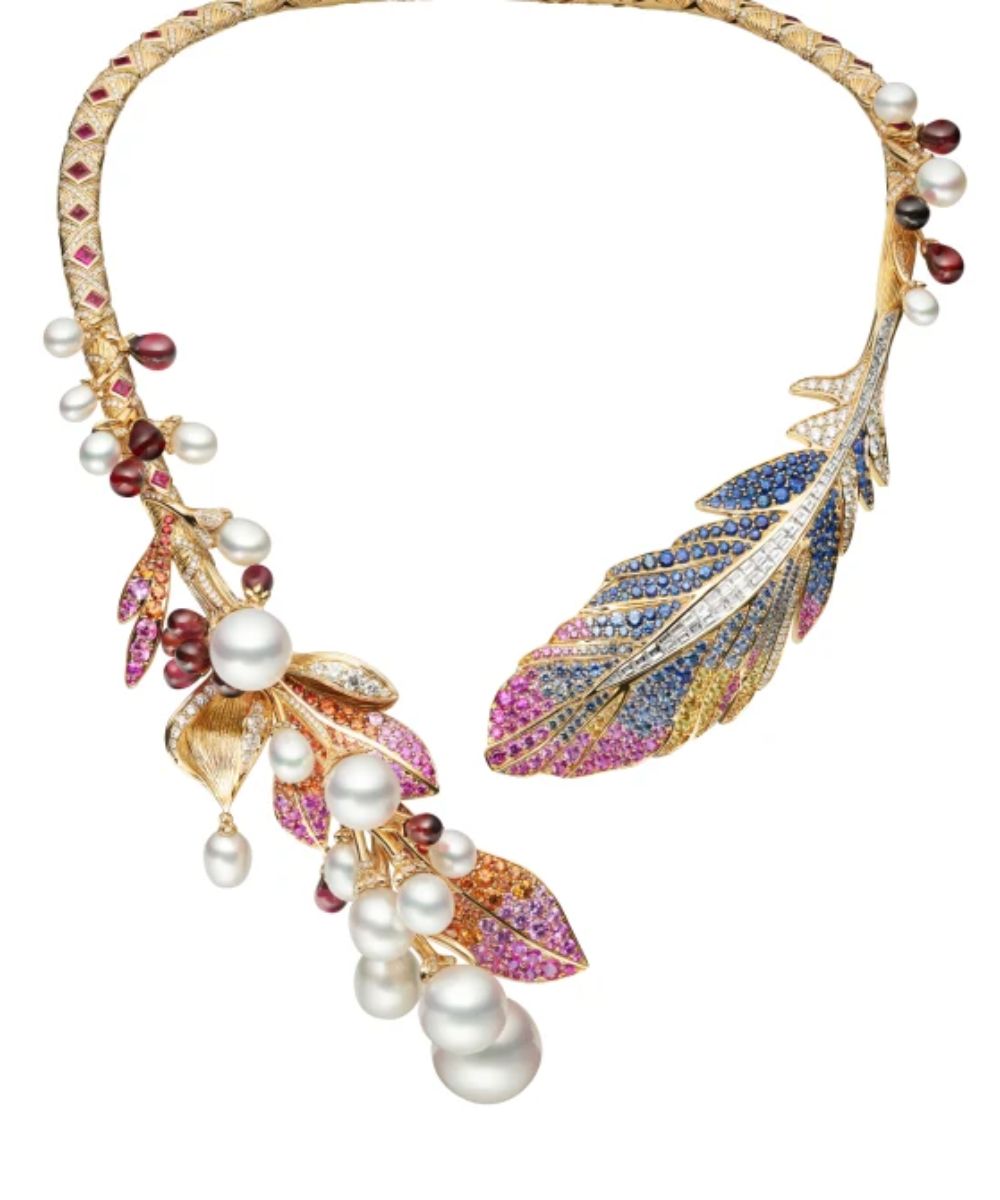 On the high jewellery side of things, Paspaley combines pearls with diamonds and coloured gemstones to create intricate pieces—often inspired by nature—that showcase the purity of its pearls while placing them firmly in the contemporary era. Highlights include the Wild Feather colliers, with the yellow gold variant splayed with rubies, diamonds, and garnets; and the Blue Sapphire Hero Lavalier Pearl Necklace, which ups the ante on the high jewellery brand’s signature style by adding marquise shaped cabochon blue sapphires into the mix.