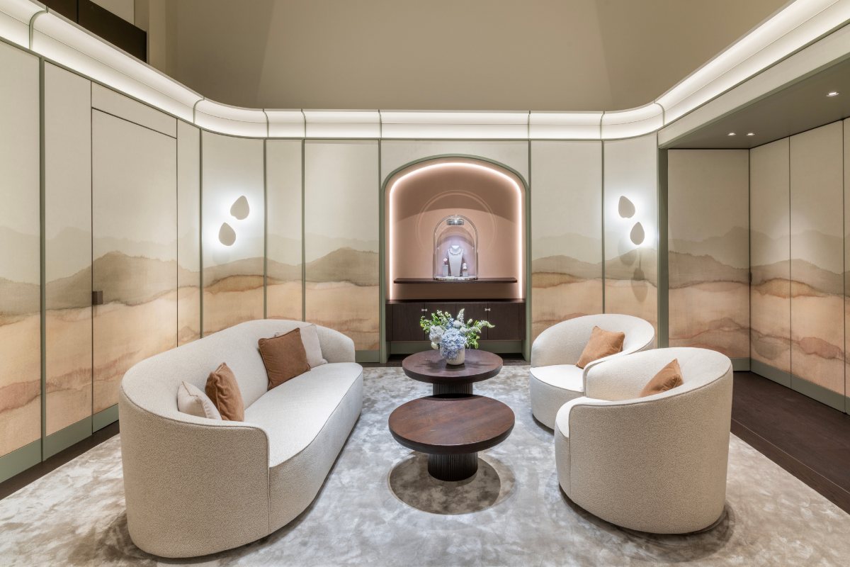 Van Cleef & Arpels has announced the renovation of its Sydney CBD boutique on 112 Castlereagh Street, with the maison temporarily relocating to 345 George Street, on the corner of Barrack Street. Spread across a single floor, the new space was conceived as a continuous enchanted landscape, with the scenography drawing inspiration from a poetic garden. The fanciful inspiration is expressed through a palette of soft and harmonious tones, with soft blues and greens gently transitioning into rosy and peachy hues, echoing nature’s ever-changing light.