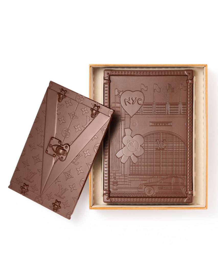 Louis Vuitton has unveiled an unexpected tribute to the brand’s rich legacy, opting for the sensorial over the sartorial. The maison has released an indulgent chocolate bar exclusively available at the Le Chocolat Maxime Frédéric counter within its New York City flagship store at 6 East 57th Street, New York City. Inspired by Pecan Pie, Louis Vuitton reinvents the American classic with 40% Madagascan milk chocolate surrounding maple syrup caramel and praline made from French pecans, complemented by shortbread biscuit for added crunch. The design of the chocolate bar references the maison’s trunk making legacy on one side, while the other features its playful mascot Vivienne clutching an ‘NYC’ balloon.