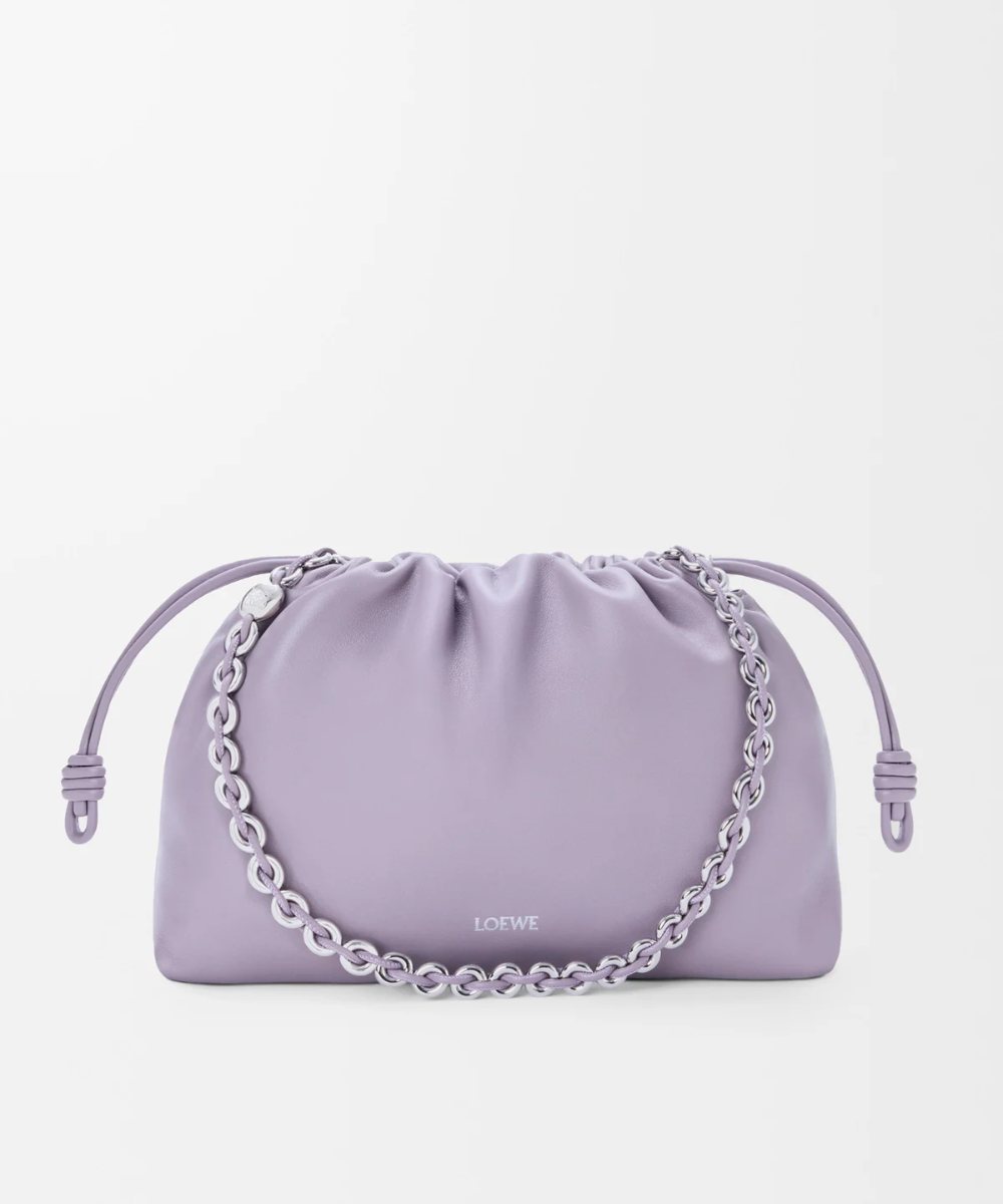 The most popular proponent of the dumpling bag style, the Loewe Flamenco nails the smooshy edible vibes with its nappa leather construction and gathered drawstring closure. The newest addition to the Flamenco line, the Flamenco Purse, takes the dumpling comparisons even further, thanks to the absence of material above the drawstrings, with the upper folding neatly into itself and giving it the appearance of an expertly crafted gyoza. The detachable donut chain can be used as a shoulder strap, but we recommend leaving it hanging down…a garnish for your dumpling, if you will.