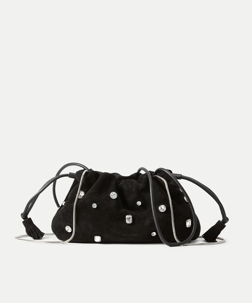 With a classic drawstring closure and concealed shoulder strap, the Veronica Beard Stash is an archetypal dumpling bag. The style comes in both standard and suede leather, with this crystal embellished style the perfect cocktail party companion.