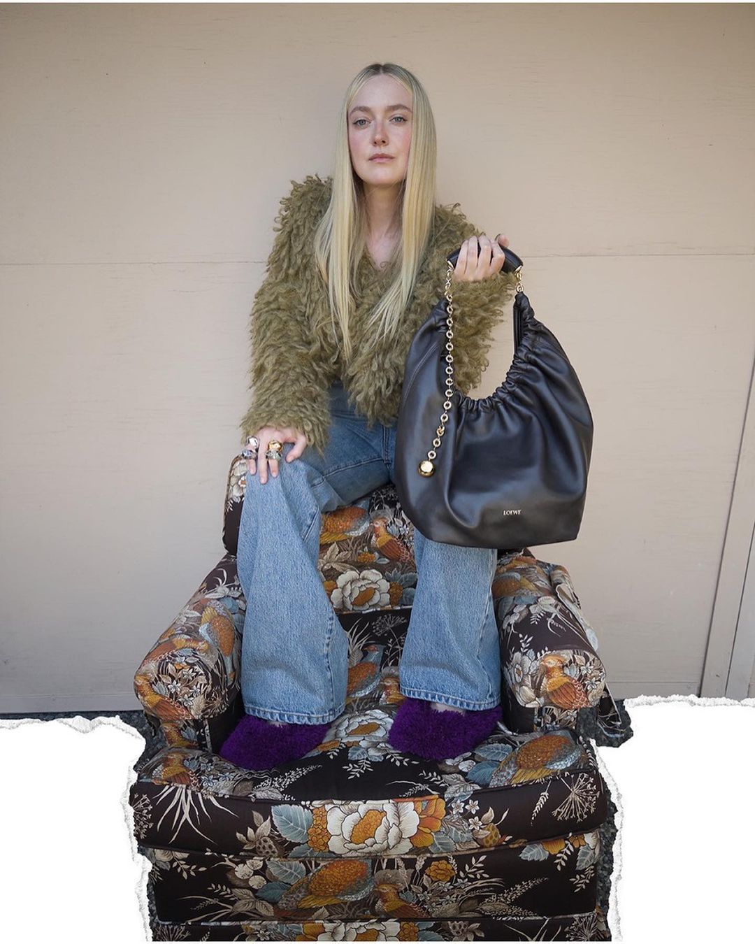 The Spring/Summer 2024 pre-collection campaign also features Dakota Fanning, Mike Faist, Josh O’Connor, Greta Lee, Rachel Jones, FeiFei Sun, and Taeyong. Actor Josh O’Conner lounges on an armchair wrapped in a monogrammed blanket, while Dakota Fanning stands armed with a healthy surplus of Puzzle Bags.