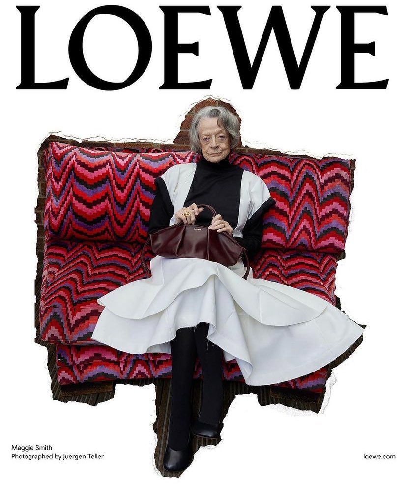The latest face of the brand? Dame Maggie Smith. Best known — to younger audiences at least — for her roles as Professor McGonagal in the Harry Potter series and Violet Crawley in Downton Abbey, the 88-year-old represents a welcome addition to the Loewe universe. Captured by Juergen Teller in the German photographer’s signature unconventionally ‘down-to-earth’ style, Smith poses in front of a brick wall clad in a fur coat and clutching a Puzzle Bag; as well as luxuriating on a patterned sofa in a (not-patterned) silk dress, a Paseo Bag resting primly on her lap.
