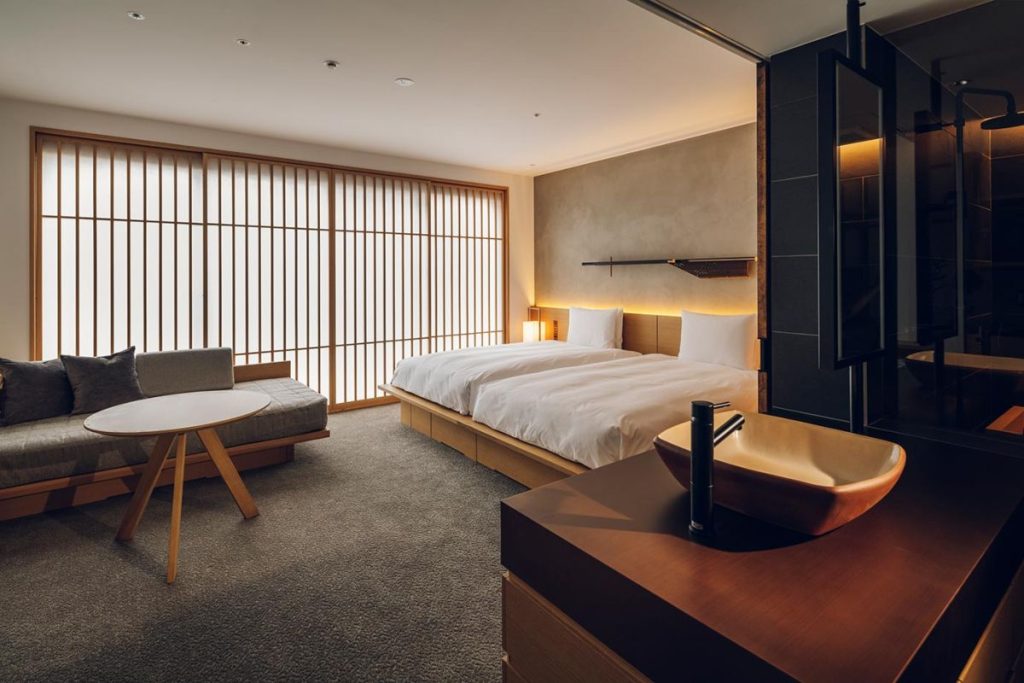 A true fusion of old and new, Hotel Kanra Kyoto showcases ‘modern machiya’ style, blending subdued materials like wood, bamboo, stone, and iron with a soothing natural colour palette of warm beige, pale green, and soft golden tones. Futon beds, shoji windows, low-slung furniture and cedar soaking bathtubs contribute to the experience, while the hotel’s central location near Kyoto station means it’s ideally placed for sightseeing.
