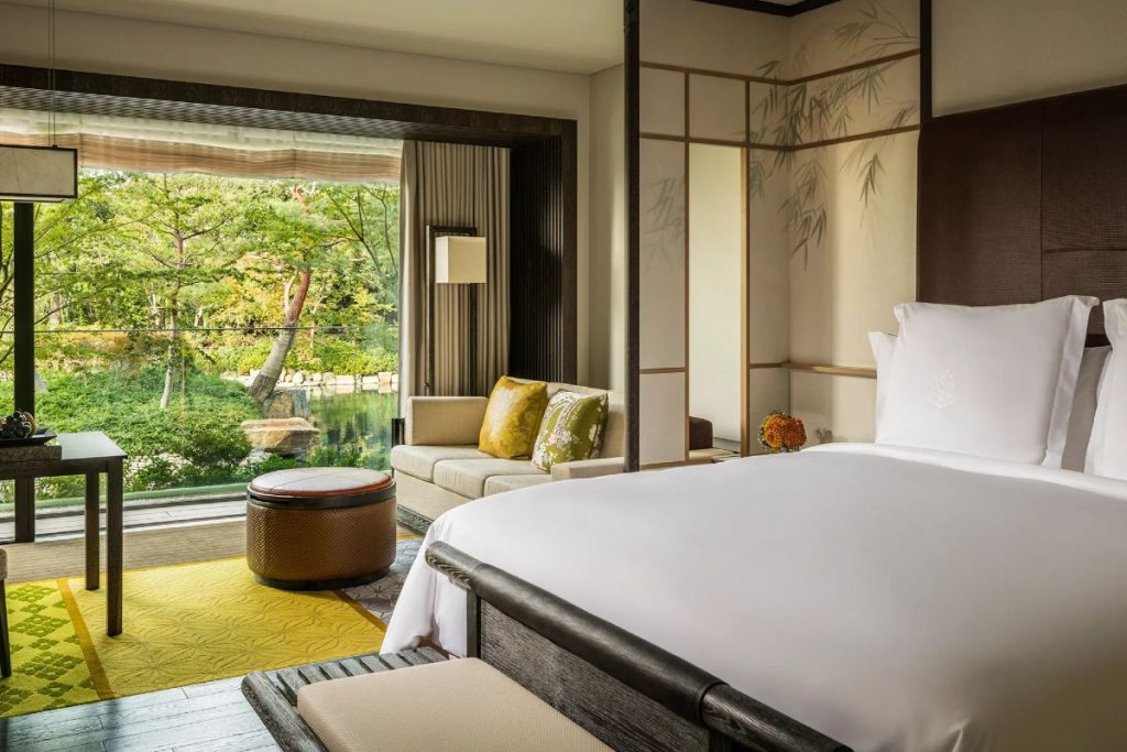 An oasis in the heart of Kyoto, Four Seasons Hotel Kyoto is built around an 800-year-old heritage pond garden. With 180 rooms, suites, and expansive residences on offer, Four Seasons Hotel Kyoto is designed for short- and long-term stays alike. Guest rooms unite Four Seasons’ signature airy elegance defined by clean lines and an abundance of natural light with the beauty of the verdant surroundings, while hyperlocal design details such as washi paper lamps, fusuma screens, and urushi lacquerware ensure spaces are rooted in place. As with all Four Seasons outposts, there are a variety of dining options—not to mention a lavish spa and indoor pool—on offer. However, a visit to the Fuju tea house is a must.