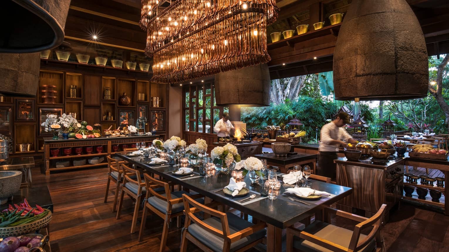 Perhaps the most interesting culinary offering of all is Rim Tai Kitchen, although the quality of each dish is—quite literally—in your hands. Not to worry though, direction and guidance from the perpetually effervescent Chef Suwattana Boonyarattananusorn (‘Chef Tor’, to guests) ensures you’ll have an enjoyable lunch at the end of the session — and head home with more than a few tips and tricks on executing your own Thai dishes. Housed within a Bill Bensley-designed teak house, the culinary school offers comprehensive private and group cooking classes, with Chef Tor taking guests from the herb garden to table. While there are several menu options on offer, a highlight is the ‘Tour of Thailand’ set, which encompasses key dishes from each region.