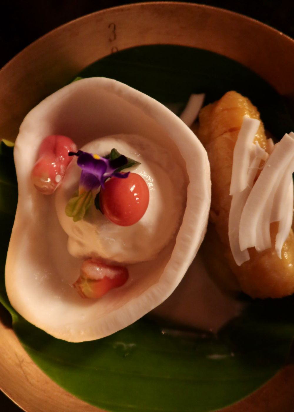 Meanwhile, North focuses on grilled and wood-fired food, with the open-air restaurant naturally oriented around an ornate fire pit, where the majority of the restaurant’s dishes are cooked. It’s Rim Tai Kitchen that’s the highlight though, with the cooking school and event space set within an elegant teak house appointed with traditional Thai ceramics. The open-plan cooking area features dramatic bell hoods above each stove and looks out at the shrine and surrounding gardens, while a statement custom amber glass chandelier serves to visually tie the communal dining table to the rest of the space. Elsewhere, ornate wall paintings reference Thai, Indian, and Chinese folklore, while the outdoor sinks of the bathroom serve as a design masterclass in and of themselves.
