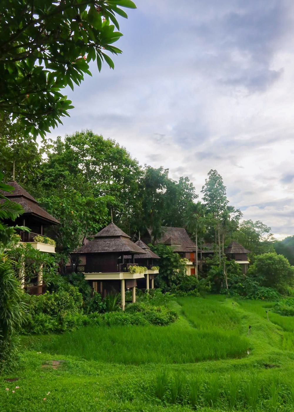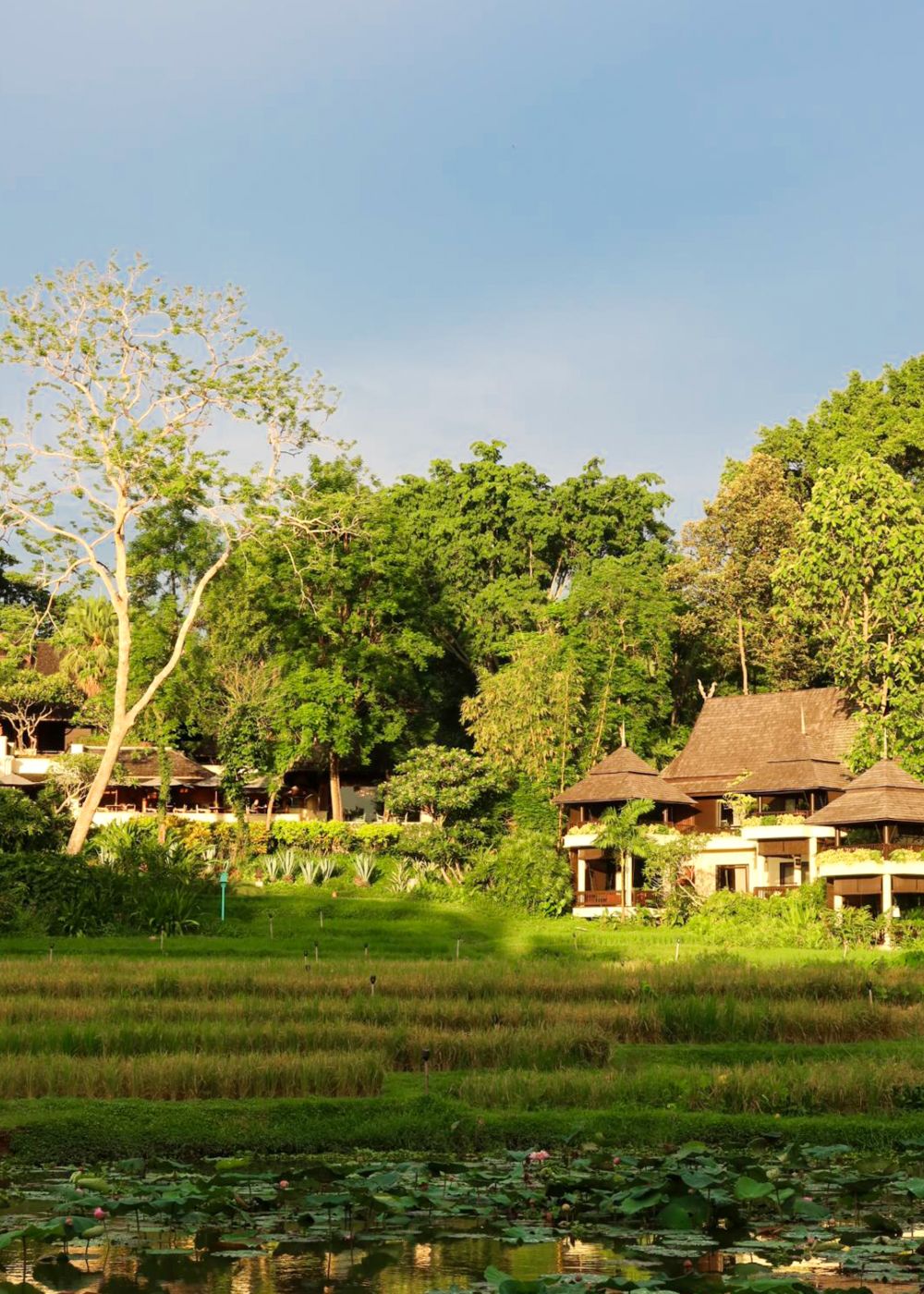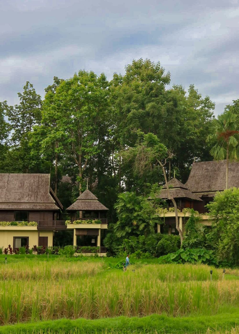Designed to blend into the surrounding landscape, the Four Seasons Chiang Mai looks to the ancient Lanna Kingdom, with this inspiration suffusing the landscape, architecture, and interior design. Working rice paddy fields—complete with a duo of hard-working water buffaloes—sit at the heart of the resort, with the gardens and built environment radiating outwards. Evocative of a small rural Thai farming village, the rice fields are surrounded by a lush subtropical jungle, with volcanic stone paths weaving between villas and bridges and wooden footbridges set over streams and rivulets.