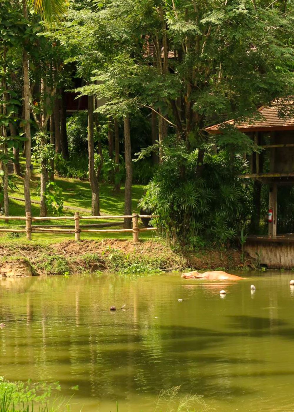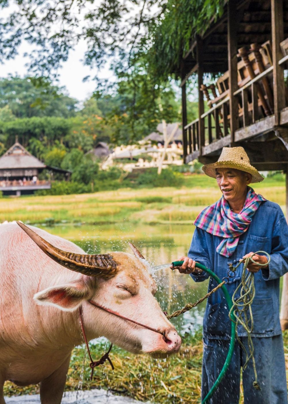 Authenticity is retained where it matters. The lush rice paddy fields form part of the working farm that employs local farmers and donates a portion of the rice cultivated on the property to local charities; here, guests can dress in a mor hom—a traditional Thai farmer’s outfit—and join the resident duo of water buffaloes in the centuries-old tradition of rice planting. Afterwards, help the hard workers hose off, with water buffalo bathing taking place every afternoon.