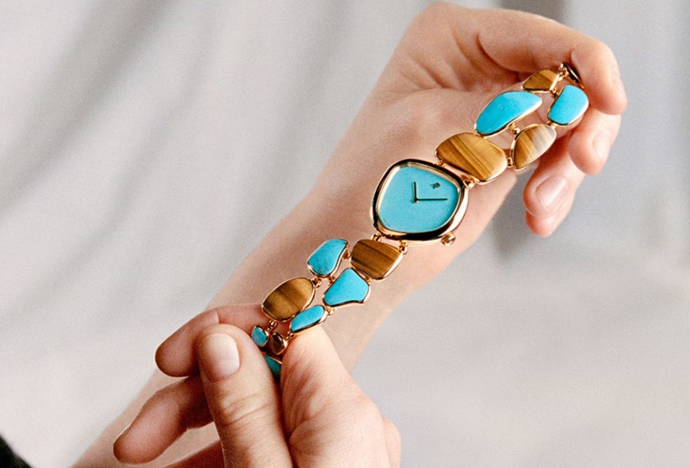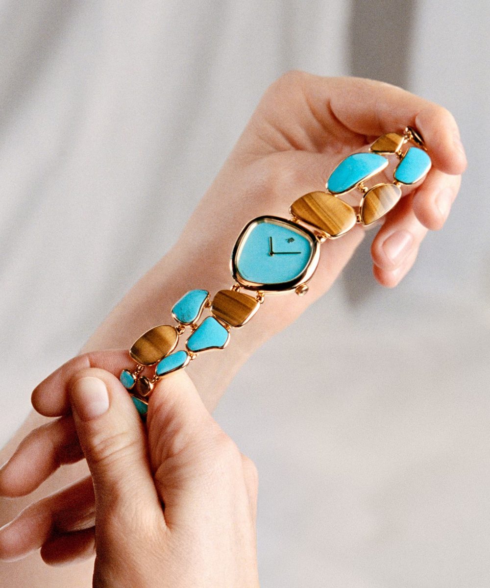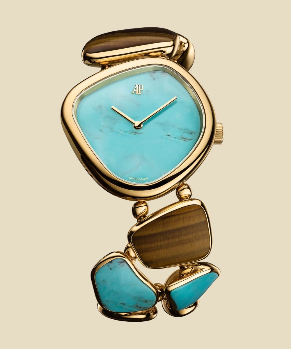 Conceptualised by designer Xavier Perrenoud, the Établisseurs Galets pays homage to the 1972 ‘Arabella’ Haute Joillarie timepiece while drawing inspiration from the smooth, organic forms of the Lac de Joux, a lake Audemars Piguet’s Le Brassus headquarters. Built around an asymmetrical turquoise dial, the similarly asymmetrical bracelet is crafted from pebble-shaped links in various sizes, executed in yellow gold and inlaid with shaped turquoise and tiger’s eye stones. The yellow gold links are connected using miniature ball joints, allowing them to curve around the wrist.