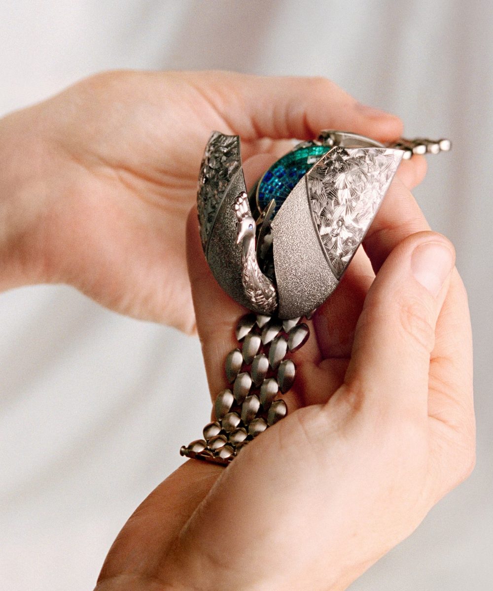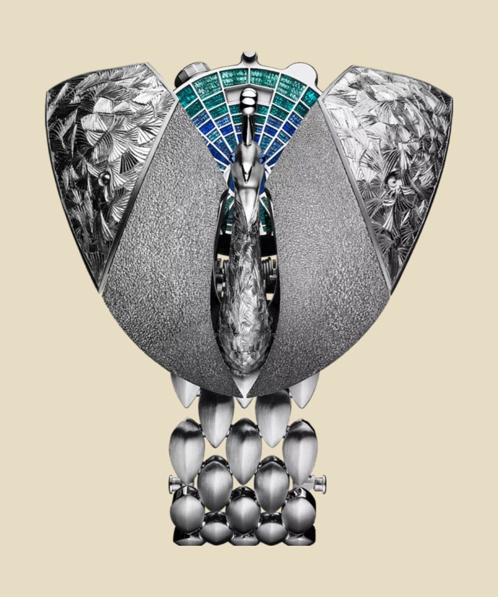 Next up, Audemars Piguet spreads its feathers with the Établisseurs Peacock, a white gold secret watch with an automation function designed by Kenan Géraud. When closed, it appears as a beetle on the wrist, but when activated, a secret opening function designed by Giulio Papi sees the peacock’s head rise and reveal its plumage, with the wings unfolding sideways and showing off the enamelled dial with a window for the dragging hour display, powered by the calibre 3098.2.