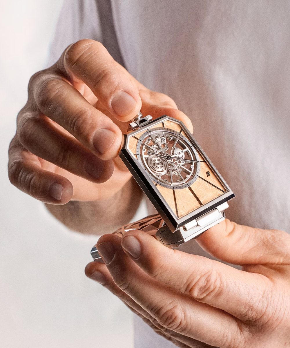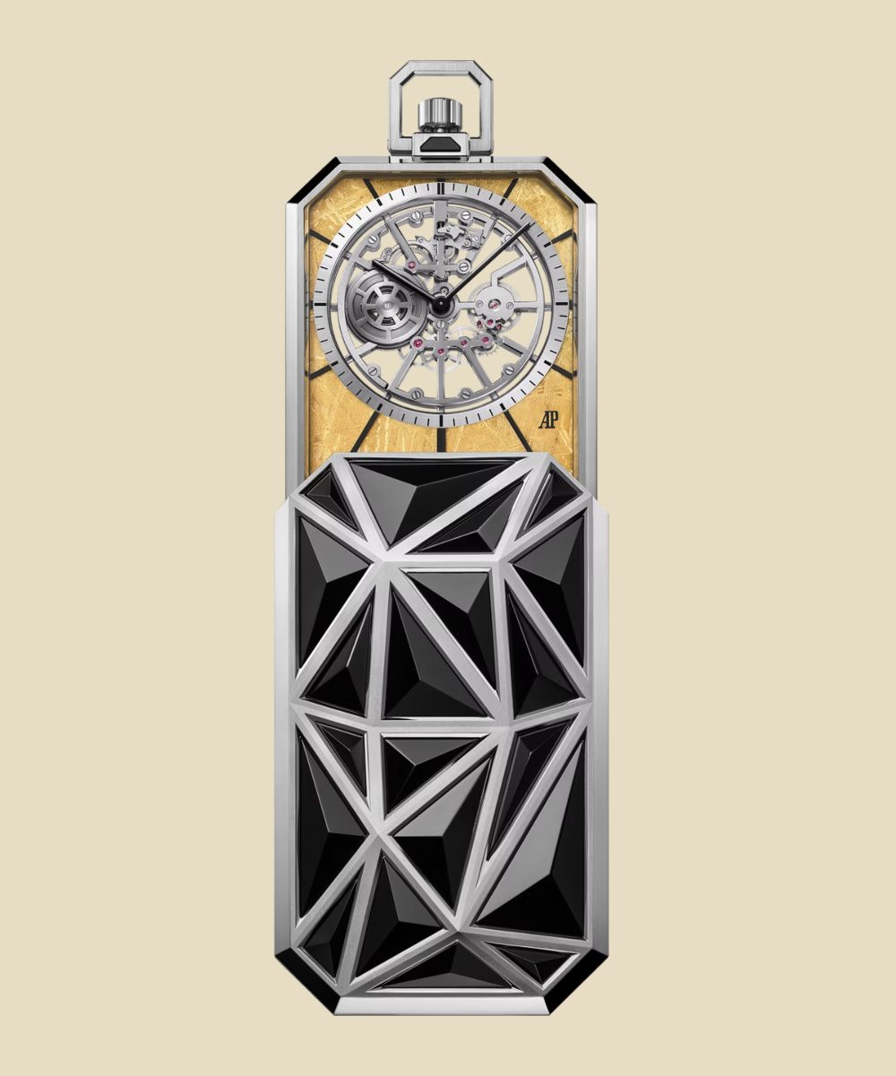 Finally, the Établisseurs Nomade combines the typologies of a pocket watch and table clock. Designed by Ludovic Python, it pairs an architecturally led contemporary exterior that sees a titanium framework surround protruding faceted stones with the calibre 7501, skeletonised using a traditional hacksaw technique that Audemars Piguet has preserved since the 1930s. By pushing two buttons, the watch slides open to reveal an inner case, which has an articulated hinge that allows it to be used as a desk clock.
