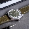 Green is arguably the most horologically zeitgeisty dial shade of the decade, however the Farer Mansfield does it a little differently. A sophisticated cushion case plays host to a sector dial in an alluring shade of tea green, diverging from the deeper hues of forest green, khaki, and heritage green often employed. The raised circular ring houses applied highly polished hour indices and Arabic numerals which are paired with slim dauphine hands. A recessed silver subdial with a grooved texture sits at 6 o’clock, and features a hand in a different shade of green. A masterful interplay of colour combined with a hand-wound movement make this an affordable watch worth getting your hands on.