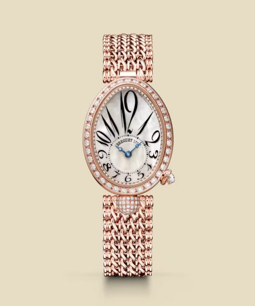 You can’t talk about cocktail watches without giving the Breguet Reine de Naples its flowers. Paying homage to the seminal timepiece the Swiss manufacture designed for Caroline Bonaparte, the Queen of Naples, in 1810, the Reine de Naples collection is defined by its ovoid case shape and balanced dials that are symmetrical on the vertical axis but create interest through asymmetry on the horizontal axis. There are numerous configurations of Breguet’s Reine de Naples, however one of our favourite references is the Reine de Naples 8928. The elegant timepiece has all the hallmarks of a beautiful cocktail watch for women: a petite 33mm x 24.95mm case size, rose gold construction, jewellery-esque woven rose gold bracelet, and a visually interesting dial courtesy of dramatically oversized Breguet numerals at 12 o’clock.