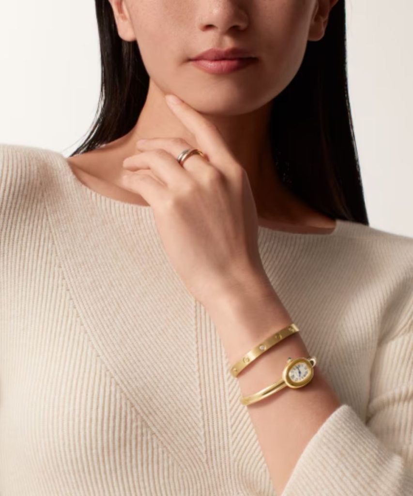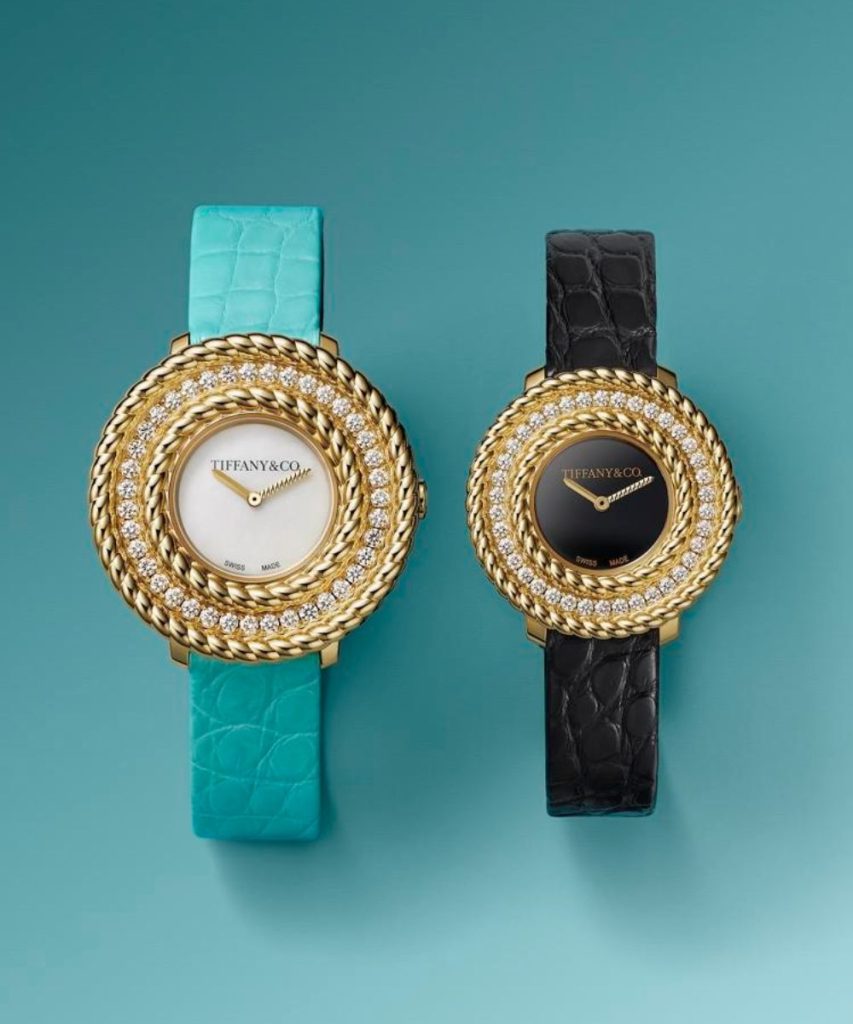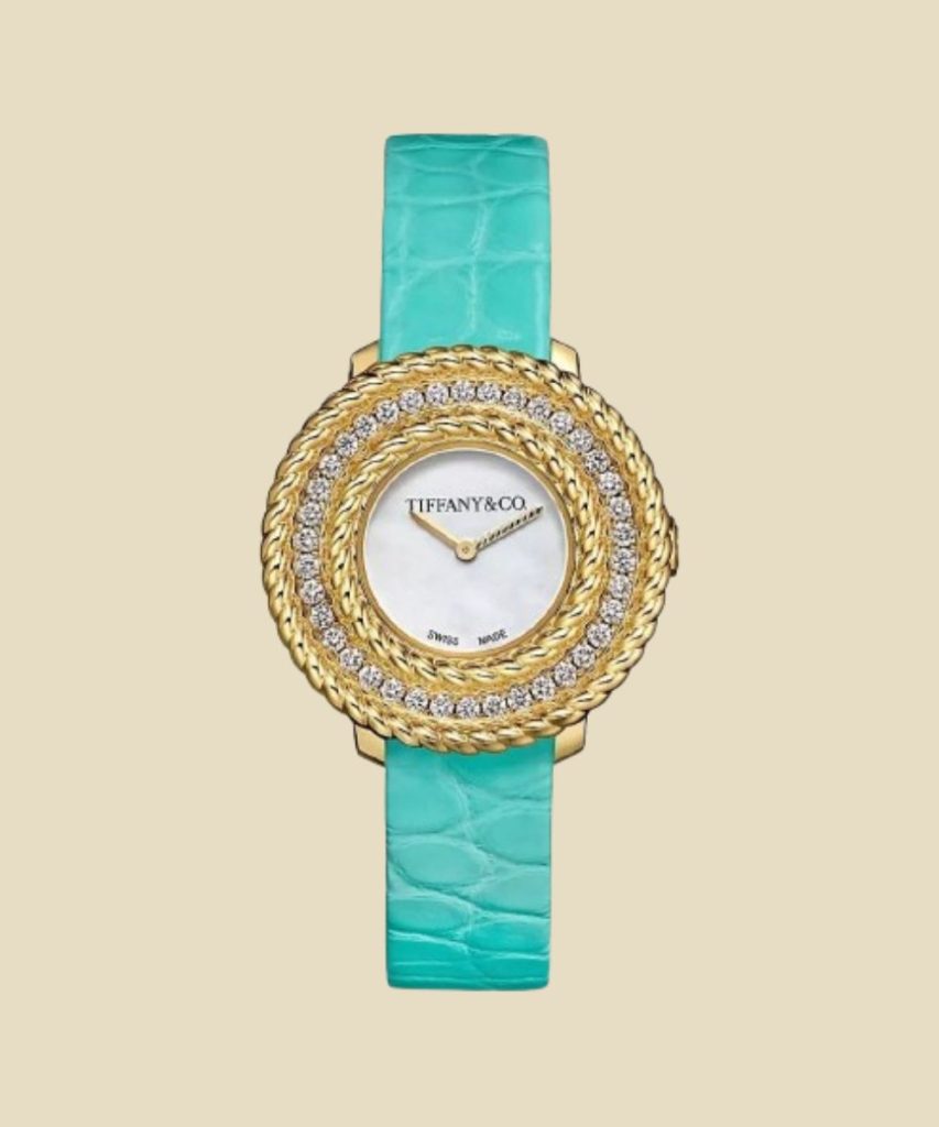 A relative newcomer to the cocktail watch scene, the Tiffany Rope Watch is inspired by legendary French jewellery designer Jean Schlumberger’s rope motif. Here, the namesake rope is crafted from yellow gold and adorned with diamonds, encircling the white mother-of-pearl dial. Presented in a dainty 27mm case, it’s ideally sized for small wrists and effortlessly skirts the boundaries of watches and jewellery. It’s powered by a solar quartz movement developed by Swiss movement manufacture La Joux-Perret, meaning it can keep time forever without being changed. The Tiffany Rope Watch is available with either a black or white dial, with a slightly larger 33mm case also on offer.