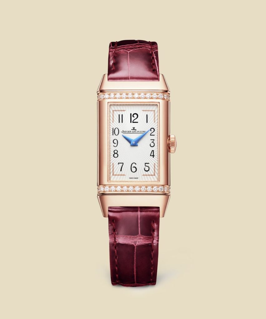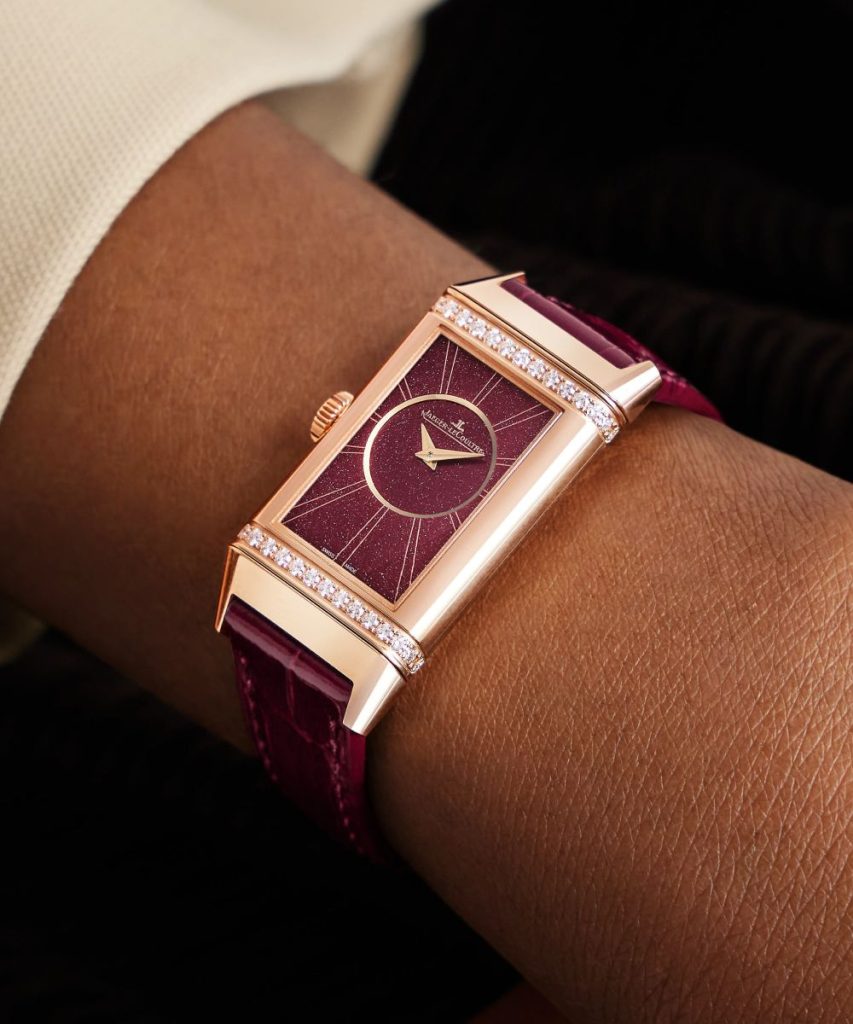 Another two-in-one timepiece, albeit in a wholly different manner, the Jaeger-LeCoultre Reverso One Duetto adapts the Swiss manufacture’s iconic design for female wearers. Originally created in 1931 for British polo players in India, the Reverso was designed with a hinge, allowing the caseback to be flipped (or reversed!) onto the outside, protecting the dial. Nearly a century later and the timepiece has transcended its utilitarian origins, with the streamlined art deco design lending itself to endless iteration and customisation. Here, the Jaeger-LeCoultre Reverso One Duetto elongates the original silhouette and gives it two dials; the first a sunburst white dial with Arabic numerals and blued hands, and the second a glitter lacquered burgundy dial with elongated rose gold hour markers. It’s presented on a colour matched burgundy leather strap. Combining technical innovation which just the right amount of flair and drama, it’s one of our favourite cocktail watches for women.