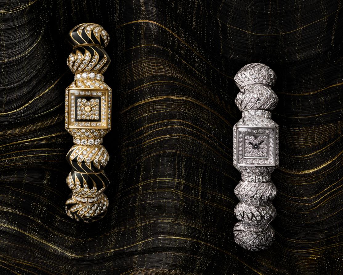 Uniting the typologies of jewellery and watchmaking, the Myst de Cartier plays with the trompe-l’oeil technique, with its clasp-less bracelet structured like a strand of articulated talismanic beads threaded onto a flexible bracelet. At the centre is a square dial with pavé set diamonds housed within a domed module, in keeping with the lines of the bracelet. There’s a yellow gold version with diamonds and black lacquer and a monochromatic white gold version with diamonds.