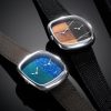 - The dual time travel watch is powered by two individual quartz movements, with the new models seeing black onyx dials accented with red, pink, and turquoise subdials