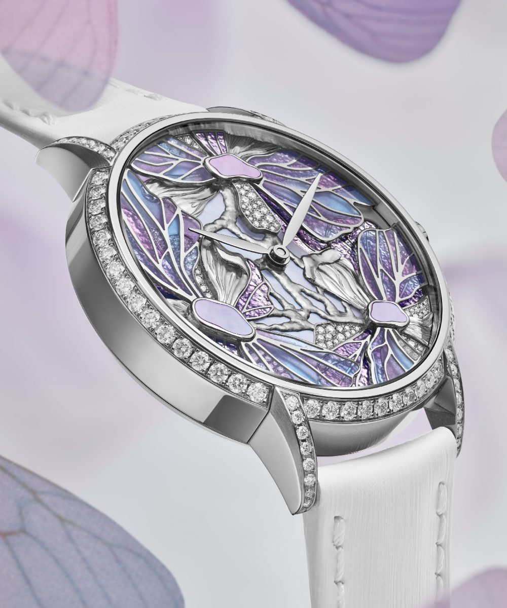 - Meanwhile, the Odonata looks to flora and fauna, creating a surrealist Garden of Eden though transluscent paillonné and plique-à-jour enamel in sky blues, mauves, and iridescent white, accompanied by diamond and mother-of-pearl details