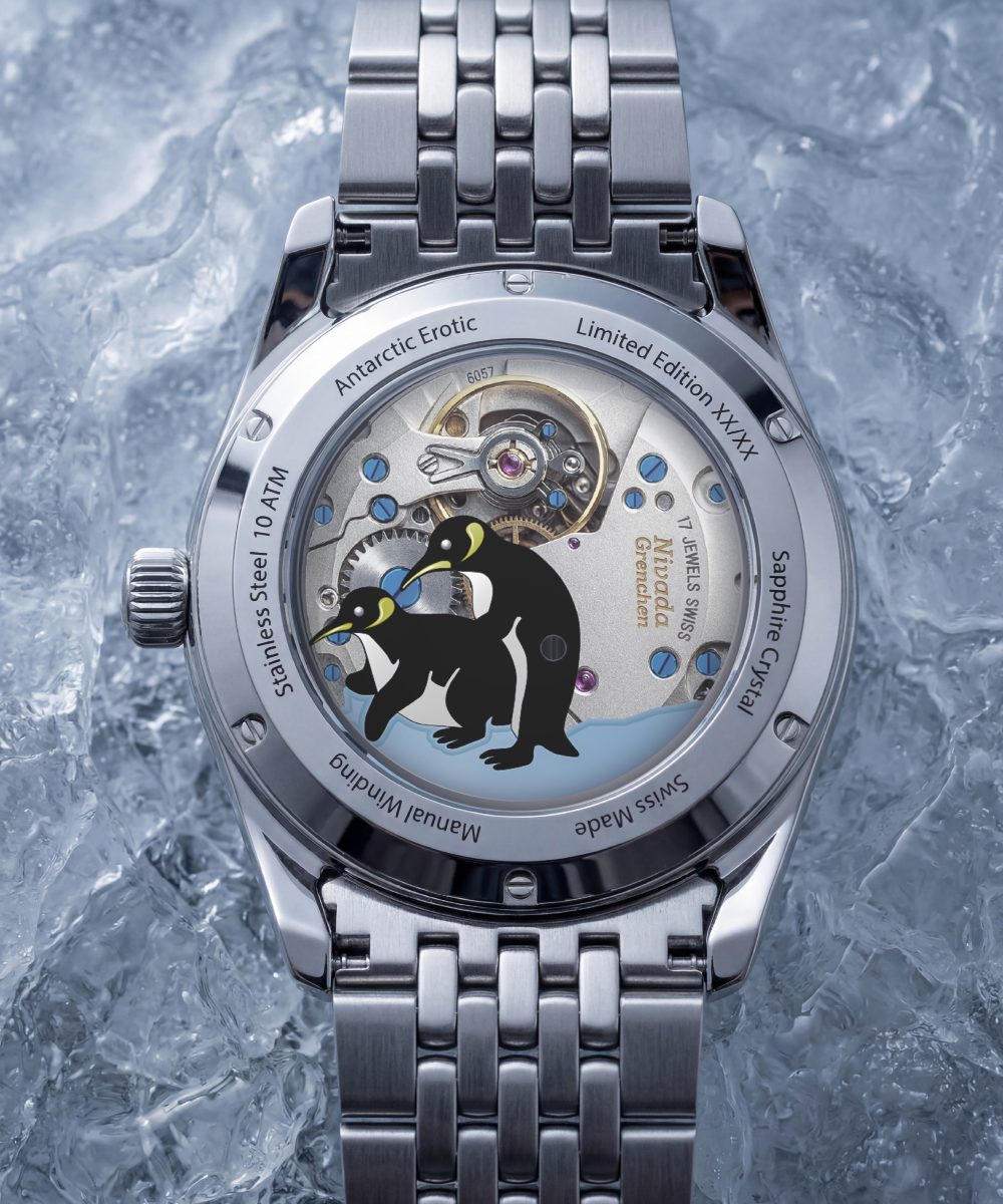 Penguins get frisky on the caseback of the Nivada Grenchen Antarctic Erotic