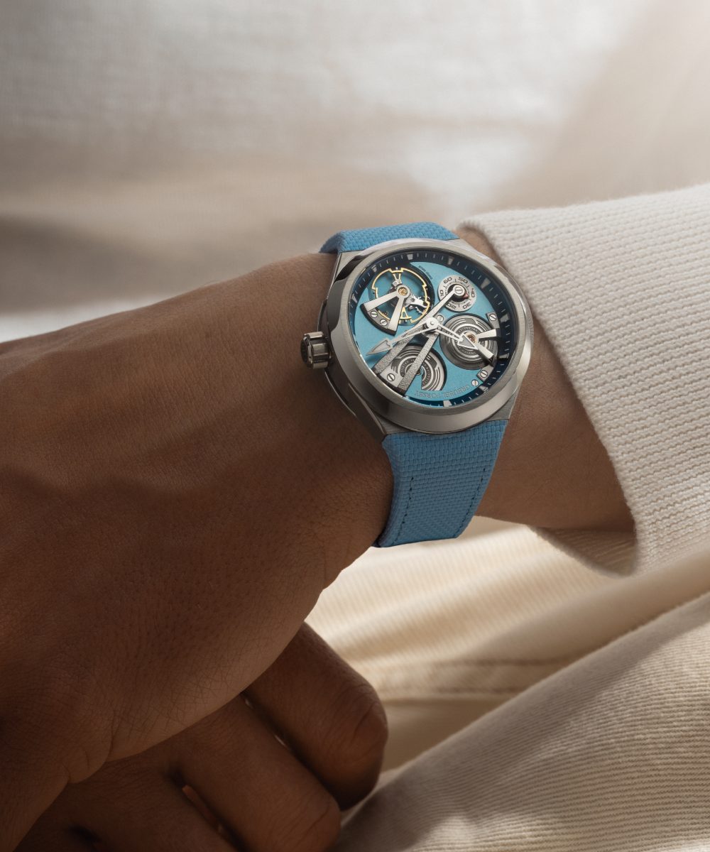 - It’s housed in the brand’s 41.5mm Convexe titanium case which sees the movement submerged within the dial