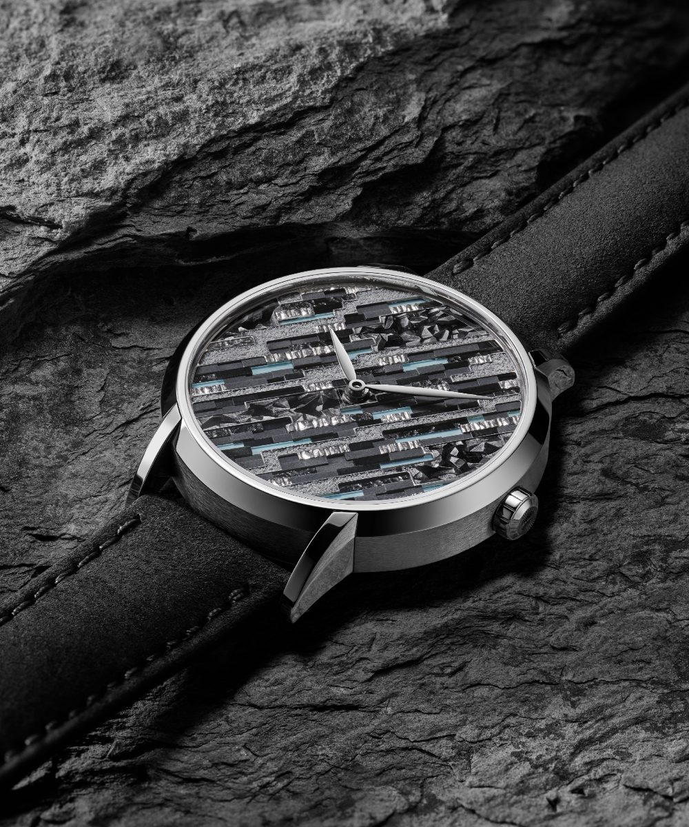 - Both timepieces are housed within a 38mm white gold case, with the Genèse employing stone marquetry in black jade and blue agate as well as engraved enamel to evoke the minerality of Earth’s rock