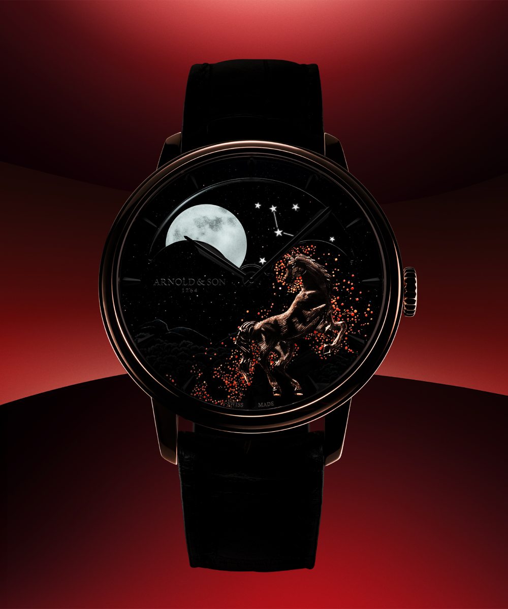 - Encased in a 41.5mm, Arnold & Son’s signature moonphase model sees a horse rear on a hill top, set in front of the black aventurine sky