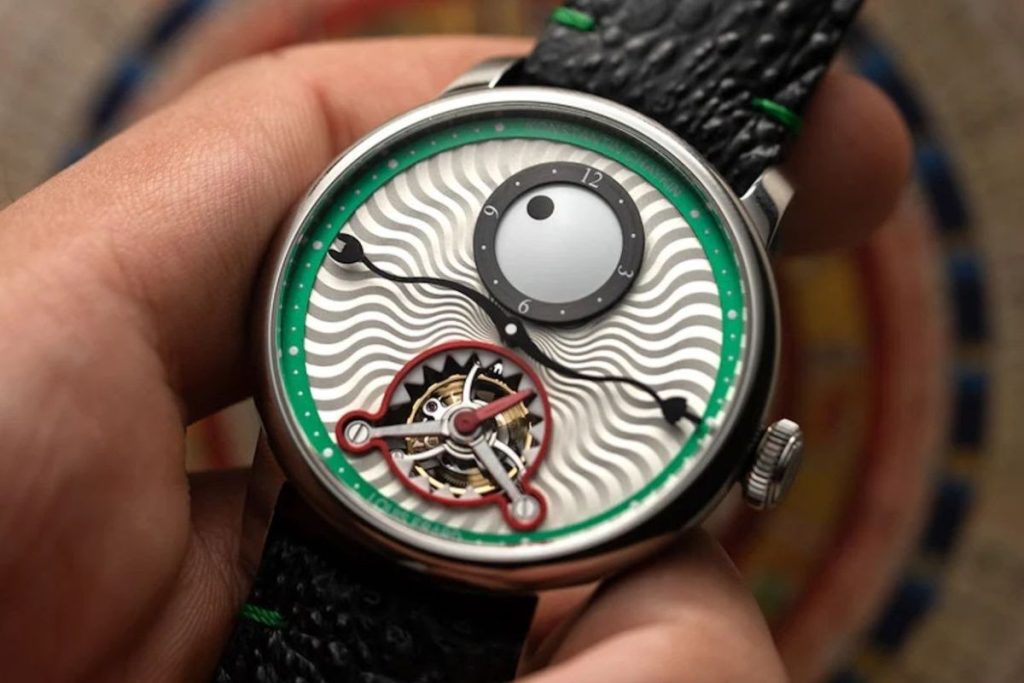 - The wavy central hand indicates the minutes, while the hours are displayed by the ‘eye’ on the top subdial and the seconds are shown on the toothy tourbillon at 6 o’clock