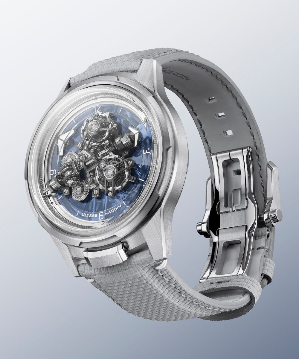What we think: Ulysse Nardin doesn’t always release watches I necessarily want to wear, but I do consistently enjoy looking at them. A quarter-century after the release of its Freak watch—the seminal timepiece that eliminated the dial, hands, and crown in favour of using the main bridge of the movement itself to indicate the minutes and a separate disc for the hours—the brand has upped the Freak quotient with the Super Freak. Employing an exaggerated version of the established design language, the Super Freak is powered by the calibre UN-252, with the automatic movement comprising 511 components, including a double tourbillon and a patented gimbal system. While Ulysse Nardin’s contemporaries are in a continual quest to make the thinnest movement, the calibre UN-252 takes on a three-dimensional form. It sits within a platinum case atop a blue dial and is what Ulysse Nardin calls “the most complicated time-only watch ever made”.” — Theo Rosen, journalist